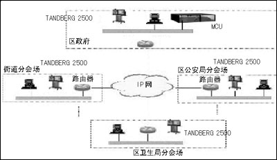此次應用的視頻會議終端位于東城區(qū)政府所轄范圍內的各重要單位,通過H.323網絡召開內部工作會議,從而方便地實現實時交互式遠程會議,會議電視系統(tǒng)設計使用速率支持1.5Mbps,控制方式采用全網星型集中式控制方式。