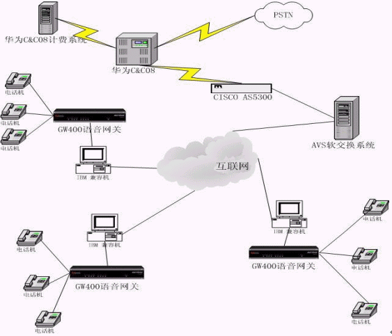 方案中使用到的設(shè)備與軟件有:普通電話機,語音網(wǎng)關(guān),電腦,ABS計費軟件,上網(wǎng)設(shè)備,AVS軟交換系統(tǒng),CISCO AS5300,華為C&C08機計費系統(tǒng)