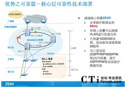 核心交換機(jī)主要是匯聚下行的全千兆智能路由交換機(jī),所以要求設(shè)備提供高密度板卡和線速轉(zhuǎn)發(fā)的能力。同時(shí)保證對(duì)下行端口進(jìn)行帶寬控制,中興采用萬兆路由交換機(jī)ZXR10 8905來滿足用戶的需求。ZXR10 8900系列萬兆路由交換機(jī)是中興通訊推出的新一代的大容量核心/匯聚路由交換機(jī)系列產(chǎn)品,主要定位于運(yùn)營(yíng)商IP城域網(wǎng)、校園網(wǎng)、電子政務(wù)網(wǎng)和大型企事業(yè)網(wǎng)等網(wǎng)絡(luò)的核心/匯聚層。ZXR10 8900系列萬兆路由交換機(jī)基于先進(jìn)的模塊化理念進(jìn)行設(shè)計(jì),并采用了基于多處理器并行處理機(jī)制和Crossbar空分交換結(jié)構(gòu)的體系結(jié)構(gòu),關(guān)鍵模塊均采用可以1:1進(jìn)行冗余備份。ZXR10 8900系列具備10GE、GE、FE等各種豐富的接口模塊,并全面支持IPv4、IPv6、組播、QOS、帶寬控制等業(yè)務(wù)功能。ZXR10 8900系列整個(gè)系統(tǒng)所具備的高可靠性、高擴(kuò)展性、良好的業(yè)務(wù)能力等特點(diǎn),可以滿足各種網(wǎng)絡(luò)核心/匯聚層的建設(shè)需求。