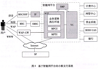 鑒于以上原因,目前中國(guó)移動(dòng)正在建設(shè)的全國(guó)范圍的小額支付系統(tǒng)已確定采用基于智能網(wǎng)平臺(tái)的建設(shè)方式。基于智能網(wǎng)平臺(tái)的小額支付系統(tǒng)如圖4所示。