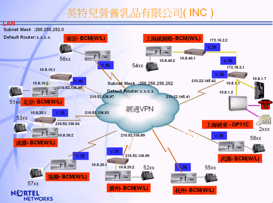 此系統(tǒng)的VPN線(xiàn)路由中國(guó)網(wǎng)通公司提供,INC上海浦東生產(chǎn)基地為主點(diǎn)(Nortel OP11C)系統(tǒng)通過(guò)ITG(Internet Telephone