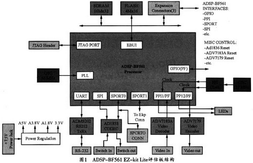 Blackfin561視頻編碼器的硬件結(jié)構(gòu)如圖1所示。該硬件平臺(tái)采用ADI公司的ADSP-BF561 EZ-kit
